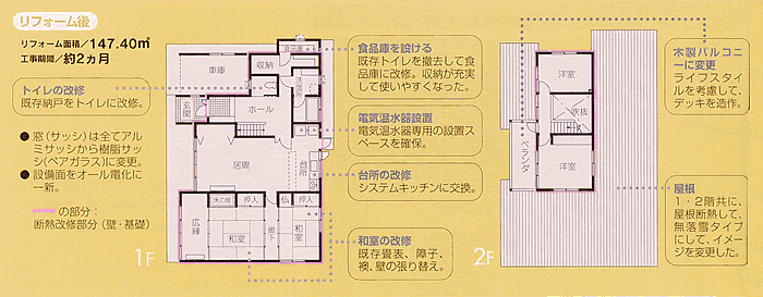 暮らしが想像しなかったほど快適に変わるという好例です。主なリフォームポイント【1】断熱改修まず、高性能グラスウールを屋根部分に施工するため、既存の3寸勾配の屋根を取り壊し、無落雪タイブにつくり替えました。 壁はサイデインクをはがし、軸間(柱と柱の間)にグラスウールを充填、外側に補強用に構造用合板を張り、 防湿シートを施して、その外側に押出法ポリスチレンフォーム保温板で外断熱。 その上に透湿・防水シートを張り、通気層を確保して新たに外壁を施工しています。 また、窓も全て樹脂サッシ(ペアガラス)に変更。 基礎部分は床下換気口を塞いで、外側に地面下の基礎のベース上まで押出法ポリスチレンフォーム保温板を張り付けました。 さらに床下空間には、基礎外周に地面より5センチの深さにヒーターを設置。湿気や結露を防ぐよう対処しています。【2】計画換気高気密・高断熱化では欠かせない計画換気は、自然給気+機械排気の第3種換気システムを採用。【3】外装新たに施工した外壁には、雨仕舞いが良く、コーキングが不要であるという利点から 「北国の外壁は鉄板がいい」と考える設計者の選択で、ガルバリウム鋼板を用いました。【4】室内内装を替えたほか、設備面ではオール電化に一新。暖房は蓄熟暖房器を採用しています。 |