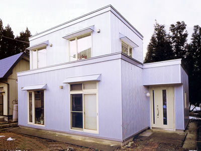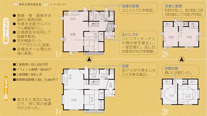 「今さら新築はできないけど、これならやってみよう」と全面リフォームを決断しました。 「これまで朝は結露との闘いでした。窓に新聞紙を張って、主人にイヤな顔をされたりして」 と奥さんの悩みのタネだった結露も断熱改修・計画換気で見事に解消。 さらに「2階の床の傾きから押入の段の高さの変更まで、事細かに相談に乗ってくれました」 と感謝の言葉でいっぱいのSさんです。 主なリフォームポイント【1】断熱改修基礎部分は床下換気口を塞ぎ、外側に地面下の基礎ベース上まで押出法ポリスチレンフォーム保湿板を張り付けました。 床下空間は湿気や結露を防ぐよう対処しています。外壁はサイデインクをはがし、軸間(柱と柱の間)にグラスウールを充填。 外側に補強用の構造用合板を張り、防湿シートを施し、その外側に押出法ポリスチレンフォーム保湿板を張り付けた付加断熱。 その上に透湿・防水シートを張り、通気層を確保して、新たに外壁を施工しました。 屋根にも高性能グラスウールを使用しています。 【2】計画換気高気密・高断熱化では欠かせない計画換気は、自然給気+機械排気の第3種換気システム。【3】外装ガルバリウム銅板の外壁は、軽くて外断熱に最適で、コーキングが不要という利点から、設計者がSさんに提案。 シンプルでモダンな外観になりました。【4】室内各8畳だった台所と居間を一体化して会話の弾む広いリビング・ダイニングに。 キッチンの窓の位置も変え、明るくなりました。設備面では電化して蓄熱式電気暖房器に。 |