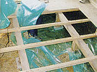 ![]() 床をはがして床下に防湿シートを敷き込む。 |